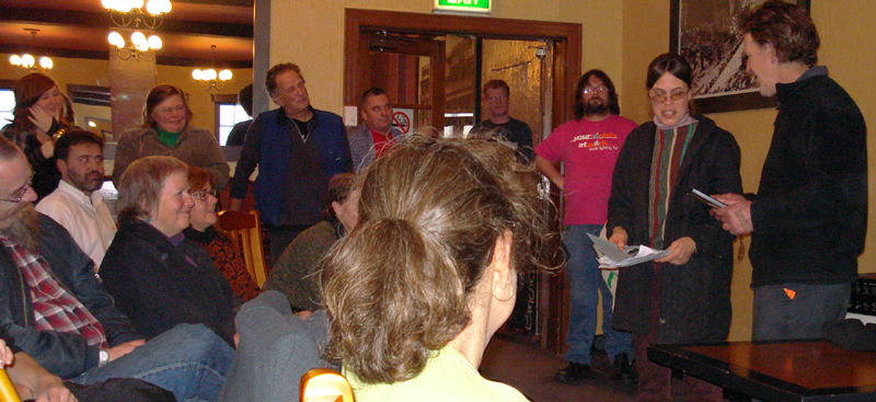 The inaugural BMUC annual gift to a Blue Mountains public school library was presented by BMUC president Kerry Cooke to Boz Brooks at Politics in the Pub 16 June 2007 (photograph: Barbara Roberts).